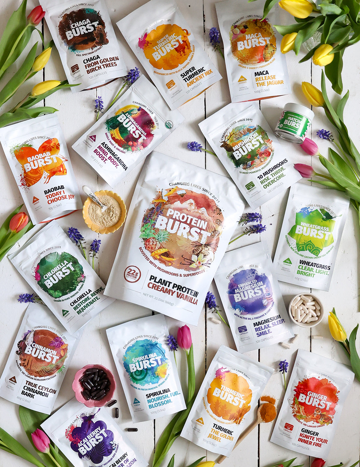 Additionally, we’ve always maintained our strict principle to support and help our wonderful farming communities and indigenous harvesters, while preserving nature and wildlife. Our ingredients come from their individually ideal geographic location on our planet, grown sustainably in nourished soil, by happy farmers and indigenous harvesters who wholeheartedly care about their land, their crops, and the wildlife around them. This harmonious, loving energy and attention are the secret ingredient in each Burst that you use.